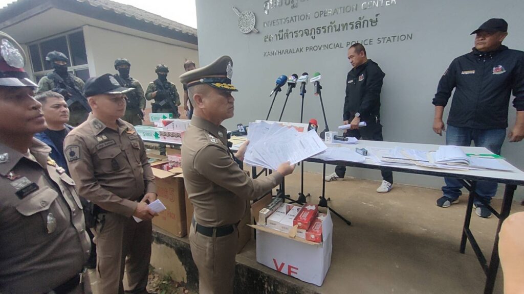 จากการรวบรวมพยานหลักฐาน ขออนุมัติหมายค้นศาลจังหวัดกันทรลักษ์ หมายเลข 55/2568 และ 56/2568 ลงวันที่ 20 พ.ย. 68 เจ้าหน้าที่เข้าตรวจค้น 2 จุดใน ต.จานใหญ่ อ.กันทรลักษ์ ได้แก่